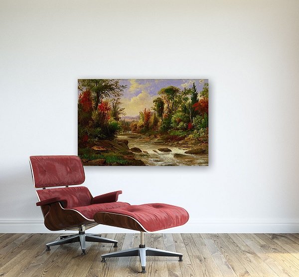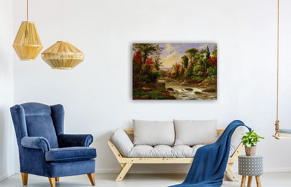 Blue sky, a shimmering running stream galloping on rocks, shrubs and plants with magnificent flowers on either side of the stream. These are some of the features of this canvas print that make it extremely beautiful.